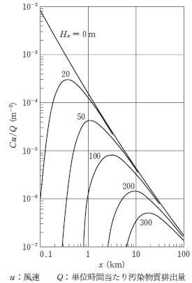 = 50m の煙源の最大着地濃度は,およそ風下1km に出現する。