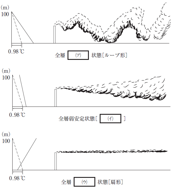 典型的な煙の形と地表面付近の気温勾配の関係を示す図において,(ア)~(ウ)の
