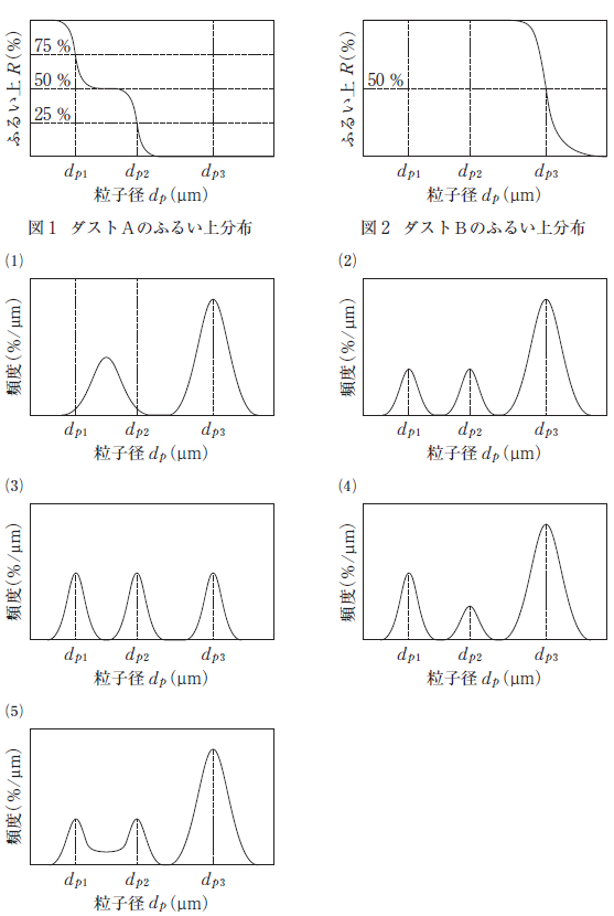 ふるい上R(%)がそれぞれ,図1 と図2 で示されるダストA,Bがある。これらのダストを質量比A:B = 1:2 で混合した試料の頻度分布として,最も適切な図はどれか。