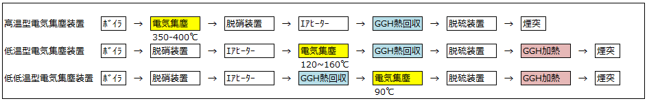 | 石炭発電 | 石灰スラリー吸収法 | アンモニア触媒還元法 | 10~20g/m3 電気集塵装置 |